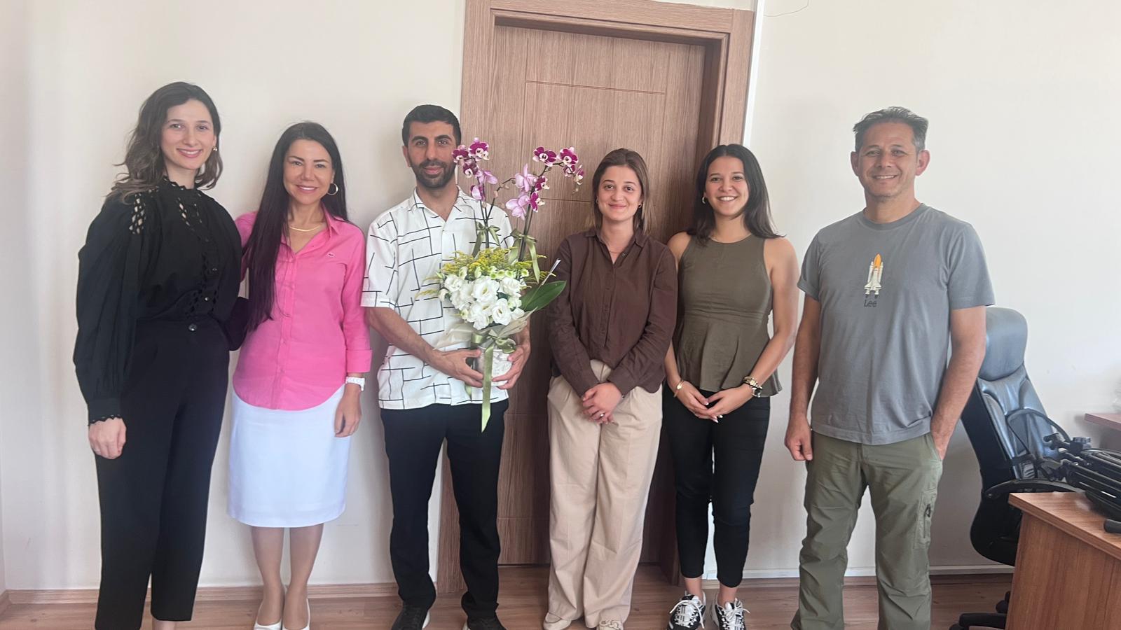 Üniversitemiz Kurumsal İletişim ve Tanıtım Koordinatörlüğü personeli Öğr. Gör. İsrafil Yücel, doktora eğitimini başarıyla tamamlayarak “Dr.” unvanını almaya hak kazanmıştır. Bu anlamlı başarı vesilesiyle, birimdeki tüm personelin katılımıyla gerçekleştirilen kutlamada, hocamıza Koordinatörümüz Doç. Dr. Sema Sağlık tarafından çiçek takdim edildi.